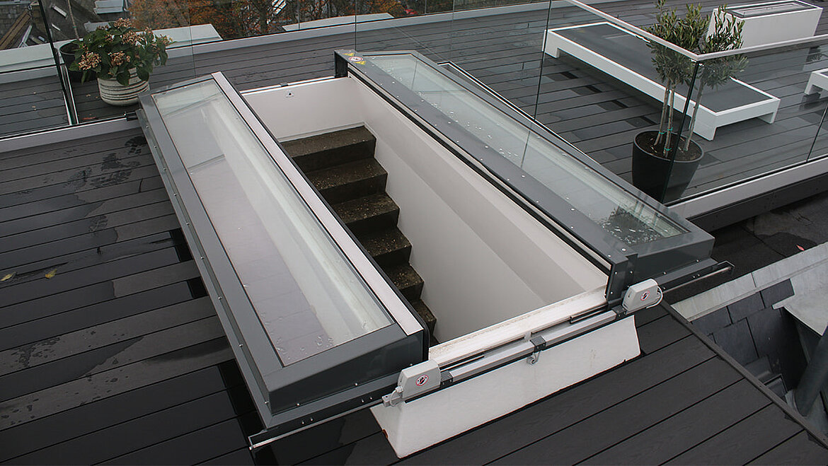 LAMILUX Flachdach Ausstiege verbinden Wohnkomfort mit smarter Funktionalität und ermöglichen den direkten Zugang zur Dachterrasse. Ob Schiebemechanismus oder großzügige Kippöffnung – sie sorgen für Licht, Luft und Komfort.