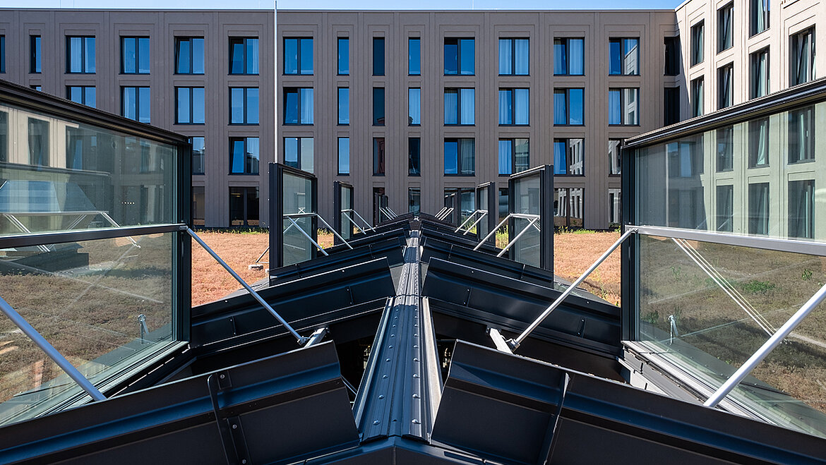 Gleichzeitig sorgt die Verglasung für hochwertige Tageslichtqualität und ermöglicht eine architektonisch saubere Integration in die Dachfläche.